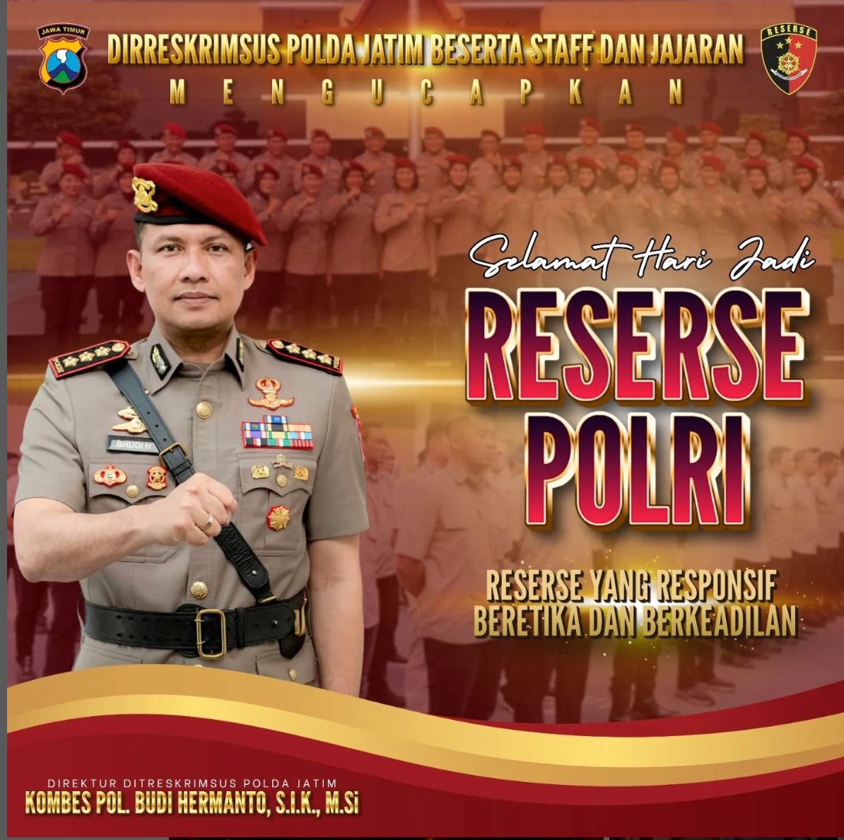 Surabaya — Direktur Reserse Kriminal Khusus (Dirreskrimsus) Polda Jawa Timur beserta staf dan jajaran mengucapkan Selamat Hari Jadi Reserse Polri yang ke-77 tahun. Perayaan ini menjadi momen penting dalam memperingati dedikasi dan pengabdian Reserse Polri dalam menjaga keamanan, keadilan, serta ketertiban di masyarakat.