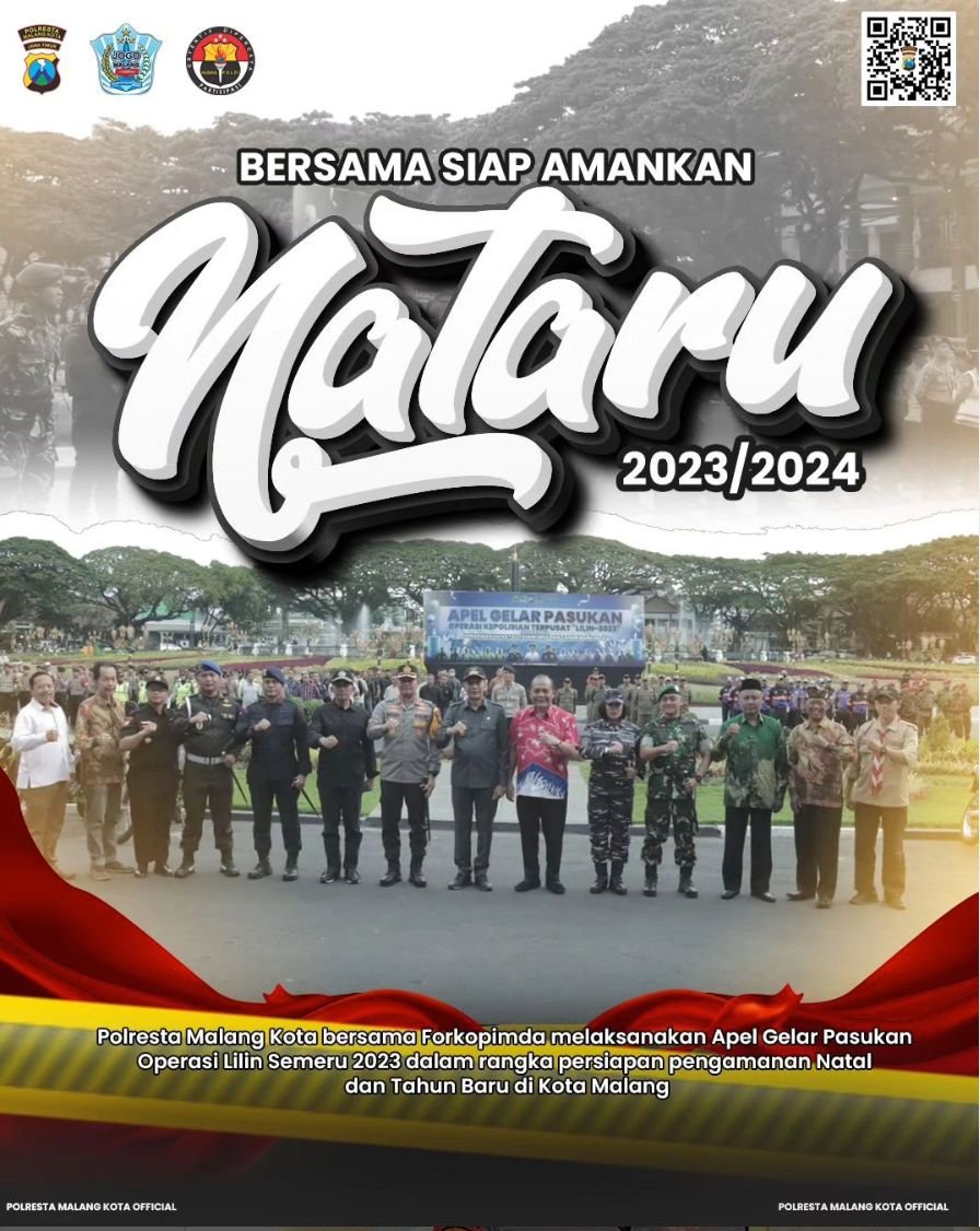 Dalam rangka pengamanan Natal Tahun 2023 dan Tahun Baru 2024, Polresta Malang Kota menggelar Apel Gelar Pasukan Operasi Kepolisian Terpusat ‘Lilin-2023’ di halaman depan Balai Kota Malang, Kamis (21/12/2023). Apel gelar pasukan ini dipimpin oleh Kapolresta Malang Kota Kombes Pol. Budi Hermanto, SIK, M.Si.